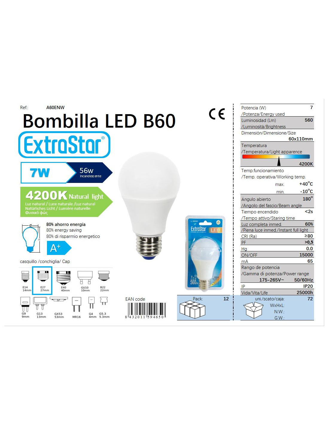 BOMBILLA BOLA LED 7W E27 SP 4200K LUZ NATURAL CJ72 [A60ENW]